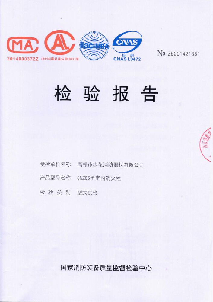 I plant was founded in June 1976, the existing staff of 600 people,including all kinds of technical and management staff of 68 people.With 50 millon yuan in fixed assets,covers an area of over 35,000 square meters,construction area of over 25,000 square meters.The establishment of a sound quality system. made a variety of "measurement of qualified certification",and become Jiangsu and more provinces of the fire association member units.Factory strong technical force,production and testing equipment,advanced technology.Production "water flower"brand water with intertace:KDK65,KD65,KY65,KN65.Fire water gun:QZG3.5/7.5,QZ3.5/7.5,QP8/0.7Z foam water gun.Indoor fire hydrant:SN65,SNW65-1,SNZ65,SNZW65-1.Fire hose reel JPS0.8-19/25.Production of "postal" card,fire with lining water:65-8,10,13.16,20,25 type;80-16,20,25 type.Water interface:KD50,65;KY50,65;KN65.Fire water gun:QZ3.5/7.5.5.Indoor fire hydrant:SN65,SNW65-1,SNZ65,SNZW65-I.And in May 2015 through the Ministry of Public Security Fire Product Conformity Assessment Center 3C version of the inspection access to all of the above products,mandatory certification,to allow the production and marketing,product marketing throughout the country,praised by the majority of users.